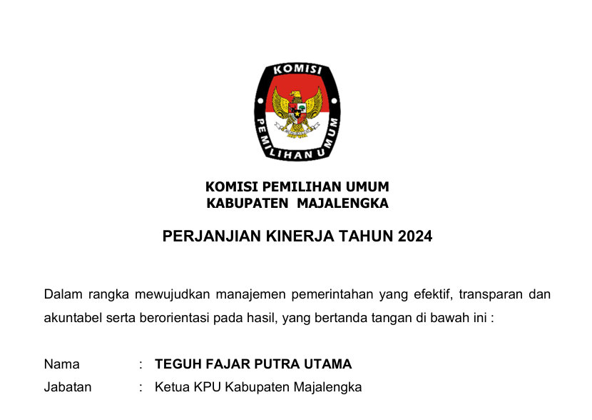 Perjanjian ini ditandatangani oleh Ketua KPU Kabupaten Majalengka, Teguh Fajar Putra Utama, bersama Sekretaris KPU, Mohamad Hasan Sukur, yang berisi kesepakatan pencapaian indikator kinerja prioritas, di antaranya: