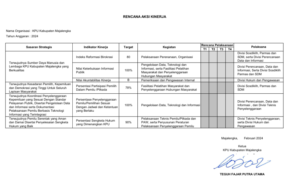 Rencana aksi ini merinci target kinerja strategis beserta indikator, jadwal pelaksanaan, dan penanggung jawab dari setiap unit kerja di lingkungan KPU Kabupaten Majalengka. Beberapa sasaran utama yang ditetapkan antara lain: