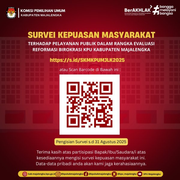 Dalam rangka meningkatkan kualitas pelayanan publik dan sebagai bagian dari pelaksanaan Reformasi Birokrasi, KPU Kabupaten Majalengka menyelenggarakan Survei Kepuasan Masyarakat (SKM) Tahun 2025.