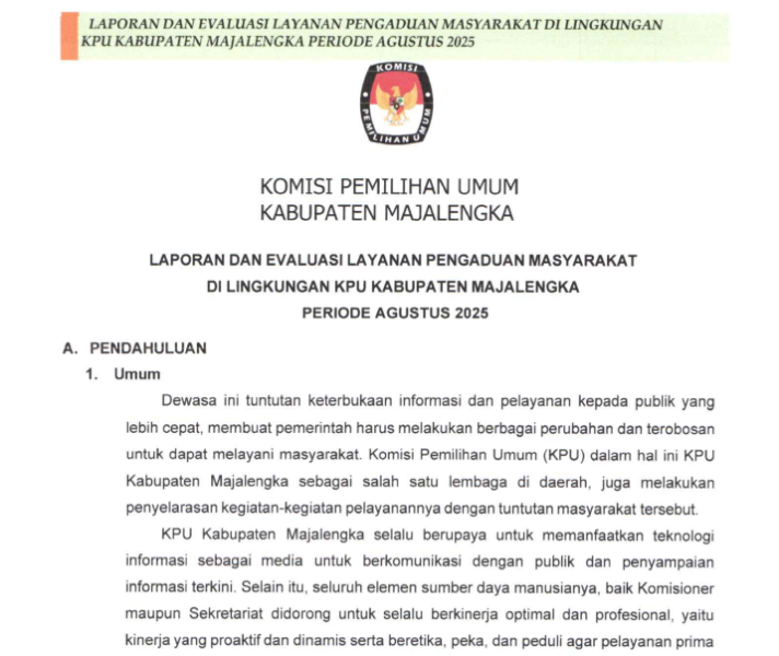Komisi Pemilihan Umum (KPU) Kabupaten Majalengka terus berupaya meningkatkan kualitas pelayanan publik, khususnya dalam hal penanganan pengaduan masyarakat. Sebagai bentuk transparansi dan akuntabilitas, KPU Kabupaten Majalengka menyusun Laporan dan Evaluasi Layanan Pengaduan Masyarakat Periode Agustus 2025.