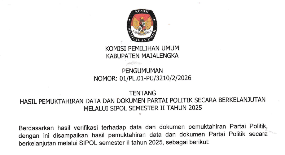 Pengumuman tersebut tertuang dalam Pengumuman KPU Kabupaten Majalengka Nomor: 01/PL.01-PU/3210/2/2026 tentang Hasil Pemutakhiran Data dan Dokumen Partai Politik Secara Berkelanjutan Melalui SIPOL Semester II Tahun 2025.