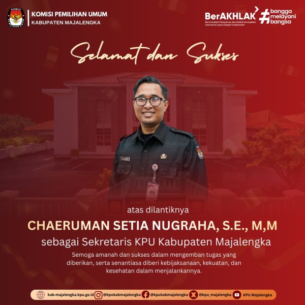Keluarga Besar Komisi Pemilihan Umum (KPU) Kabupaten Majalengka mengucapkan selamat dan sukses atas dilantiknya Bapak Chaeruman Setia Nugraha, S.E., M.M. sebagai Sekretaris KPU Kabupaten Majalengka.