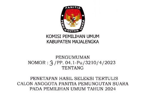 - KPU Kabupaten Majalengka menetapkan hasil seleksi tertulis Calon Anggota Panitia Pemungutan Suara Pada Pemilihan Umum Tahun 2024 sebagaimana terlampir.