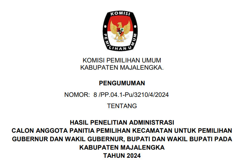 Sehubungan dengan Komisi Pemilihan Umum Kabupaten Majalengka telah melaksanakan tahapan Penelitian Administrasi Calon Anggota Panitia Pemilihan Kecamatan pada untuk Pemilihan Gubernur dan Wakil Gubernur, Bupati dan Wakil Bupati Tahun 2024, disampaikan beberapa hal sebagai berikut: