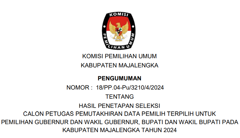 Berdasarkan PENGUMUMAN NOMOR : 18/PP.04-Pu/3210/4/2024 TENTANG HASIL PENETAPAN SELEKSI CALON PETUGAS PEMUTAKHIRAN DATA PEMILIH TERPILIH UNTUK PEMILIHAN GUBERNUR DAN WAKIL GUBERNUR, BUPATI DAN WAKIL BUPATI PADA KABUPATEN MAJALENGKA TAHUN 2024.