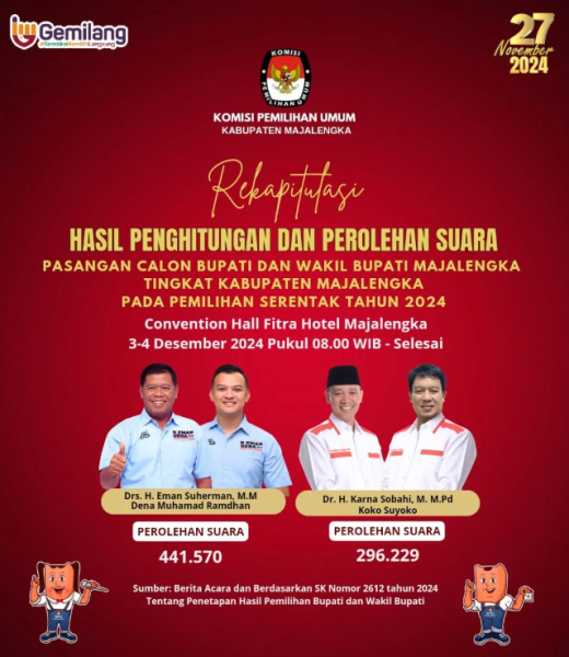 Rekapitulasi perolehan suara ini dilaksanakan pada 3-4 Desember 2024 di Convention Hall Fitra Hotel Majalengka, dihadiri oleh berbagai pihak terkait, termasuk KPU, Bawaslu, saksi dari masing-masing pasangan calon, serta unsur pemerintahan dan keamanan daerah.