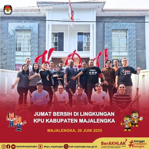 Majalengka, 20 Juni 2025 – Komisi Pemilihan Umum (KPU) Kabupaten Majalengka melaksanakan kegiatan Jumat Bersih di lingkungan kantor sebagai bagian dari komitmen untuk menjaga kebersihan dan kenyamanan tempat kerja sekaligus mendukung program Pemerintah Kabupaten Majalengka.
