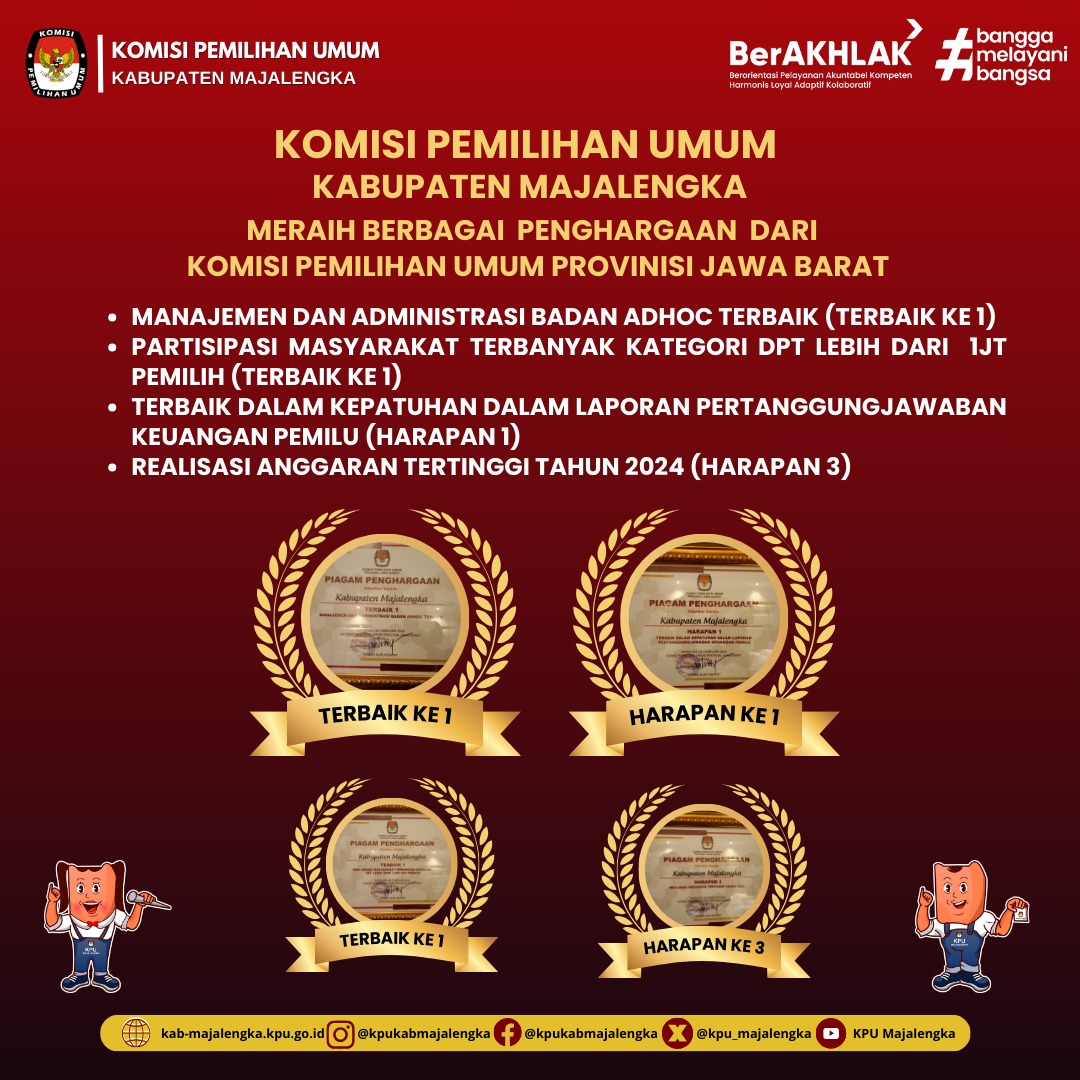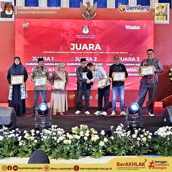 Majalengka - Komisi Pemilihan Umum (KPU) Kabupaten Majalengka kembali menorehkan prestasi membanggakan di tingkat Provinsi Jawa Barat. Pada ajang penghargaan yang digelar oleh KPU Provinsi Jawa Barat, KPU Kabupaten Majalengka berhasil meraih sejumlah penghargaan bergengsi atas kinerja optimal dalam berbagai aspek penyelenggaraan Pemilu.