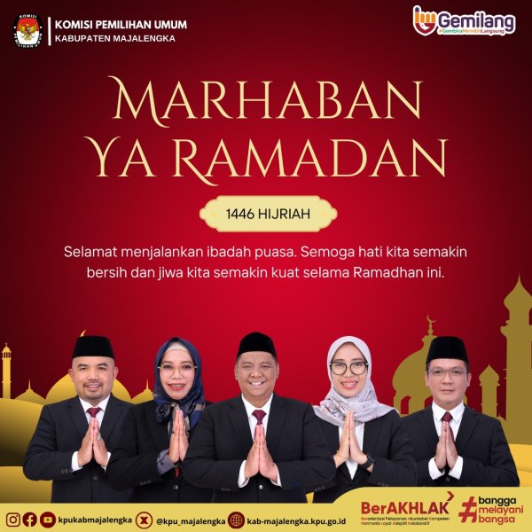Majalengka – Dalam rangka menyambut datangnya bulan suci Ramadan 1446 Hijriah, Komisi Pemilihan Umum (KPU) Kabupaten Majalengka menyampaikan ucapan selamat menjalankan ibadah puasa kepada seluruh masyarakat. Dengan semangat kebersamaan, KPU Majalengka mengajak seluruh elemen masyarakat untuk menjadikan bulan Ramadan sebagai momentum memperkuat kebersihan hati dan memperkokoh jiwa yang kuat dalam menjalani aktivitas sehari-hari.