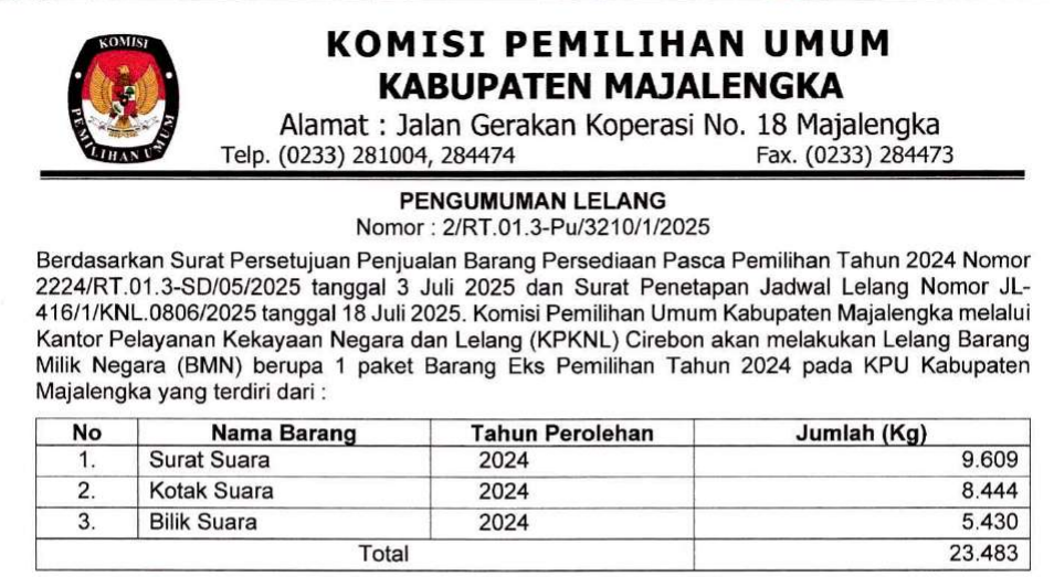 Majalengka – Komisi Pemilihan Umum (KPU) Kabupaten Majalengka mengumumkan pelaksanaan lelang terbuka (open bidding) atas Barang Milik Negara (BMN) berupa logistik bekas Pemilu Tahun 2024. Lelang tersebut dilaksanakan berdasarkan Surat Persetujuan Penjualan Barang Persediaan Bekas Pemilihan Tahun 2024 Nomor 2224/RT.01.3-SD/05/2025 tertanggal 3 Juli 2025 serta penetapan jadwal lelang dari KPKNL Cirebon.
