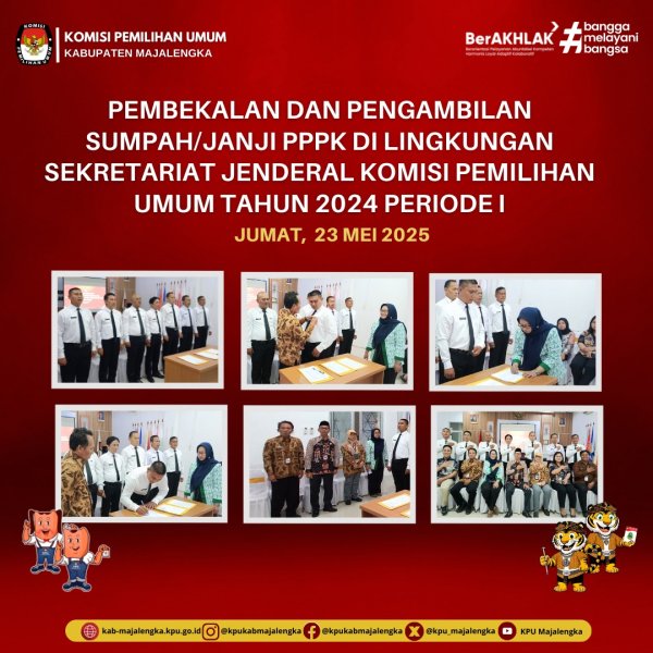 Para PPPK yang telah dinyatakan lulus seleksi tahun 2024 mengikuti prosesi pengambilan sumpah/janji sebagai bentuk resmi pengangkatan dan komitmen dalam menjalankan tugasnya di lingkungan KPU. Di KPU Kabupaten Majalengka, kegiatan ini difasilitasi langsung oleh sekretariat, dengan prosesi pengambilan sumpah dilaksanakan secara serentak sesuai arahan dari KPU RI.