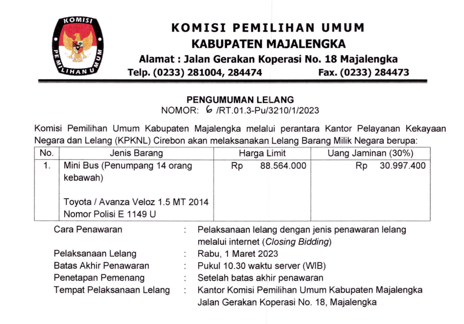 Lelang Barang Milik Negara Mobil Mini Bus dilingkungan KPU Kabupaten Majalengka