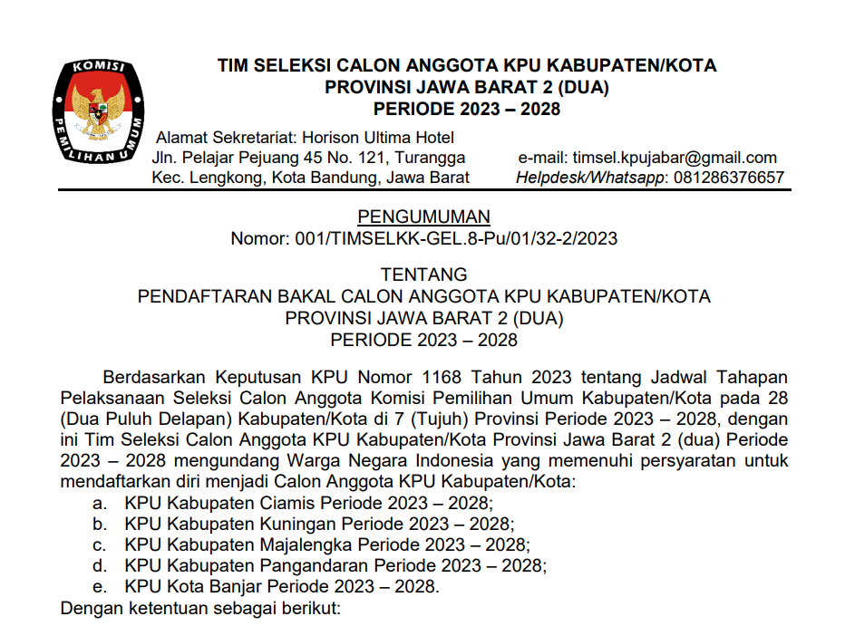 Berdasarkan Keputusan KPU Nomor 1168 Tahun 2023 tentang Jadwal Tahapan Pelaksanaan Seleksi Calon Anggota Komisi Pemilihan Umum Kabupaten/Kota pada 28 (Dua Puluh Delapan) Kabupaten/Kota di 7 (Tujuh) Provinsi Periode 2023 – 2028, dengan ini Tim Seleksi Calon Anggota KPU Kabupaten/Kota Provinsi Jawa Barat 2 (dua) Periode 2023 – 2028 mengundang Warga Negara Indonesia yang memenuhi persyaratan untuk mendaftarkan diri menjadi Calon Anggota KPU Kabupaten/Kota: