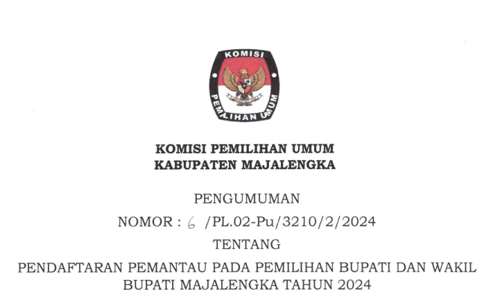Berdasarkan Peraturan Komisi Pemilihan Umum Nomor 9 Tahun 2022 tentang Partisipasi Masyarakat dalam Pemilihan Umum dan Pemilihan Gubernur dan Wakil Gubernur, Bupati dan Wakil Bupati, dan/atau Walikota dan Wakil Walikota dan Peraturan Komisi Pemilihan Umum Nomor 2 Tahun 2024 tentang Tahapan dan Jadwal Pemilihan Gubernur dan Wakil Gubernur, Bupati dan Wakil Bupati, serta Walikota dan Wakil Walikota Tahun 2024, Komisi Pemilihan Umum Kabupaten Majalengka dengan ini membuka pendaftaran lembaga pemantau pada Pemilihan Bupati dan Wakil Bupati Majalengka Tahun 2024 dengan ketentuan sebagai berikut: