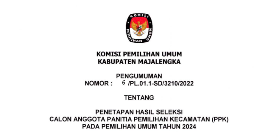 Berdasarkan Berita Acara Rapat Pleno KPU Kabupaten Majalengka Nomor: 152/PP.04.1-BA/3210/4/2022 tanggal 14 Desember 2022 tentang Penetapan Seleksi Calon Anggota Panitia Pemilihan Kecamatan (PPK) untuk Pemilihan Umum Tahun 2024, disampaikan hal-hal sebagai berikut: