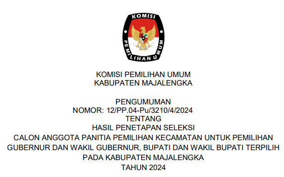 PENGUMUMAN NOMOR: 12/PP.04-Pu/3210/4/2024 TENTANG HASIL PENETAPAN SELEKSI CALON ANGGOTA PANITIA PEMILIHAN KECAMATAN UNTUK PEMILIHAN GUBERNUR DAN WAKIL GUBERNUR, BUPATI DAN WAKIL BUPATI TERPILIH PADA KABUPATEN MAJALENGKA TAHUN 2024.