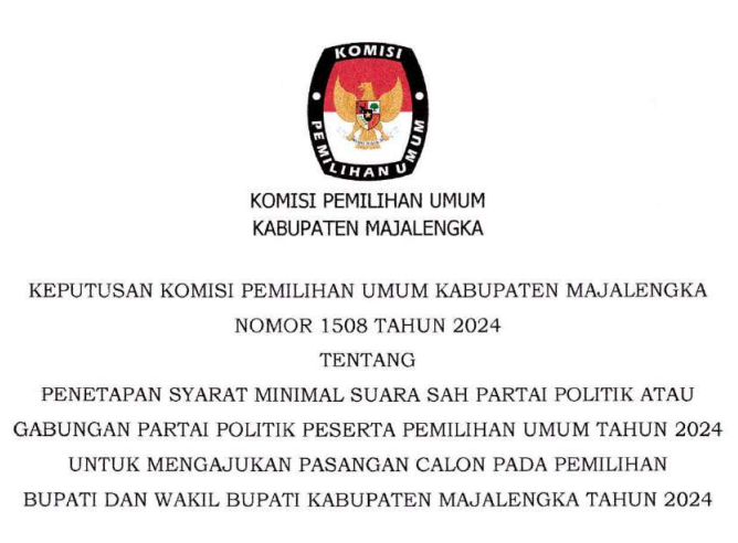 KEPUTUSAN KOMISI PEMILIHAN UMUM KABUPATEN MAJALENGKA NOMOR 1508 TAHUN 2024 TENTANG PENETAPAN SYARAT MINIMAL SUARA SAH PARTAI POLITIK ATAU GABUNGAN PARTAI POLITIK PESERTA PEMILIHAN UMUM TAHUN 2024 UNTUK MENGAJUKAN PASANGAN CALON PADA PEMILIHAN BUPATI DAN WAKIL BUPATI KABUPATEN MAJALENGKA TAHUN 2024