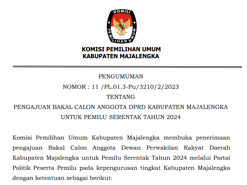 Komisi Pemilihan Umum Kabupaten Majalengka membuka penerimaan pengajuan Bakal Calon Anggota Dewan Perwakilan Rakyat Daerah Kabupaten Majalengka untuk Pemilu Serentak Tahun 2024 melalui Partai Politik Peserta Pemilu pada kepengurusan tingkat Kabupaten Majalengka dengan ketentuan sebagai berikut :