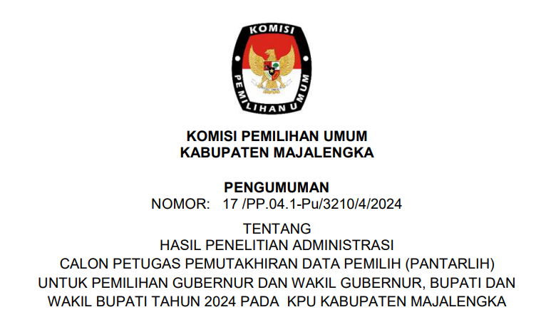 Berdasarkan PENGUMUMAN NOMOR: 17 /PP.04.1-Pu/3210/4/2024 TENTANG HASIL PENELITIAN ADMINISTRASI CALON PETUGAS PEMUTAKHIRAN DATA PEMILIH (PANTARLIH) UNTUK PEMILIHAN GUBERNUR DAN WAKIL GUBERNUR, BUPATI DAN WAKIL BUPATI TAHUN 2024 PADA KPU KABUPATEN MAJALENGKA.