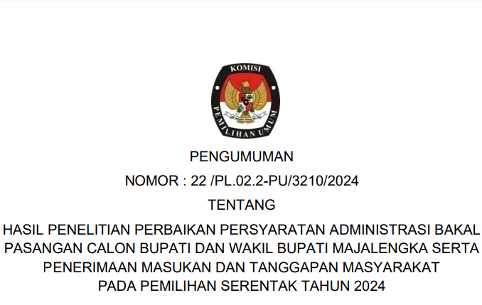 Pengumuman Nomor : 22 /Pl.02.2-PU/3210/2024 Tentang Hasil Penelitian Perbaikan Persyaratan Administrasi Bakal Pasangan Calon Bupati Dan Wakil Bupati Majalengka Serta Penerimaan Masukan Dan Tanggapan Masyarakat Pada Pemilihan Serentak Tahun 2024.