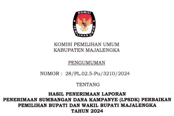 PENGUMUMAN NOMOR : 28/PL.02.5-Pu/3210/2024 TENTANG HASIL PENERIMAAN LAPORAN PENERIMAAN SUMBANGAN DANA KAMPANYE (LPSDK) PERBAIKAN PEMILIHAN BUPATI DAN WAKIL BUPATI MAJALENGKA TAHUN 2024