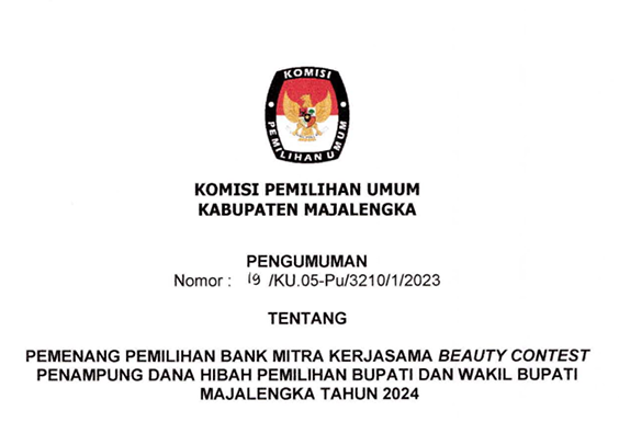 Berdasarkan Berita Acara Nomor : 463/PK.01-BA/3210/4/2023 tanggal Tujuh Belas bulan November tahun Dua Ribu Dua Puluh Tiga tentang Penetapan Bank Penampung Dana Hibah Pemilihan Bupati dan Wakil Bupati Majalengka Tahun 2024, bersama ini diumumkan bahwa Pemenang Seleksi Beauty Contest Bank Penampung Dana Hibah Pemilihan Bupati dan Wakil Bupati Majalengka Tahun 2024 adalah:
