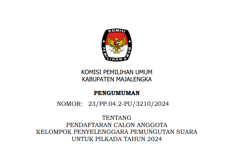 Pengumuman Nomor: 23/PP.04.2-PU/3210/2024 Tentang Pendaftaran Calon Anggota Kelompok Penyelenggara Pemungutan Suara Untuk Pilkada Tahun 2024. Dalam rangka pembentukan KPPS untuk Pemilihan Gubernur dan Wakil Gubernur dan Bupati dan Wakil Bupati Tahun 2024, Komisi Pemilihan Umum Kabupaten Majalengka mengundang Warga Negara Indonesia yang memenuhi persyaratan untuk mendaftarkan diri menjadi anggota KPPS untuk Pemilihan Gubernur dan Wakil Gubernur dan Bupati dan Wakil Bupati Tahun 2024, Komisi Pemilihan Umum Kabupaten Majalengka dengan ketentuan sebagai berikut: