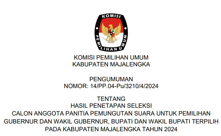 PENGUMUMAN NOMOR: 14/PP.04-Pu/3210/4/2024 TENTANG HASIL PENETAPAN SELEKSI CALON ANGGOTA PANITIA PEMUNGUTAN SUARA UNTUK PEMILIHAN GUBERNUR DAN WAKIL GUBERNUR, BUPATI DAN WAKIL BUPATI TERPILIH PADA KABUPATEN MAJALENGKA TAHUN 2024
