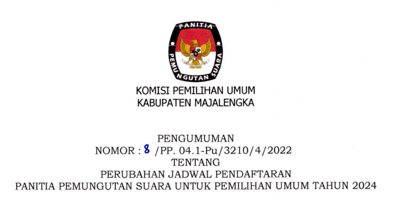 Sehubungan dengan terbitnya Keputusan Komisi Pemilihan Umum Nomor 534 Tahun 2022 tentang Perubahan atas Keputusan Komisi Pemilihan Umum Nomor 476 Tahun 2022 tentang Pedoman Teknis Pembentukan Badan Adhoc Penyelenggara Pemilihan Umum dan Pemilihan Gubernur dan Wakil Gubernur, Bupati dan Wakil Bupati, dan Walikota dan Wakil Walikota yang mengatur mengenai jadwal pembentukan PPS di dalamnya dengan ini, KPU Kabupaten Majalengka menyampaikan hal-hal sebagai berikut :