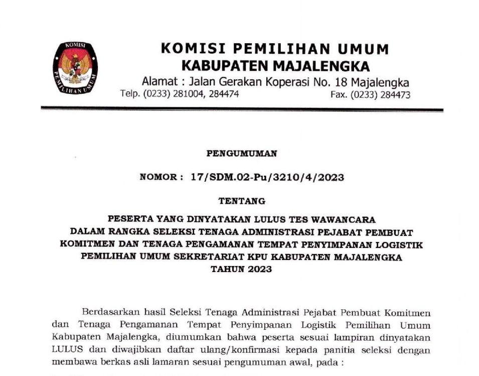 Berdasarkan hasil Seleksi Tenaga Administrasi Pejabat Pembuat Komitmen dan Tenaga Pengamanan Tempat Penyimpanan Logistik Pemilihan Umum Kabupaten Majalengka, diumumkan bahwa peserta sesuai lampiran dinyatakan LULUS dan diwajibkan daftar ulang/konfirmasi kepada panitia seleksi dengan membawa berkas asli lamaran sesuai pengumuman awal, pada :