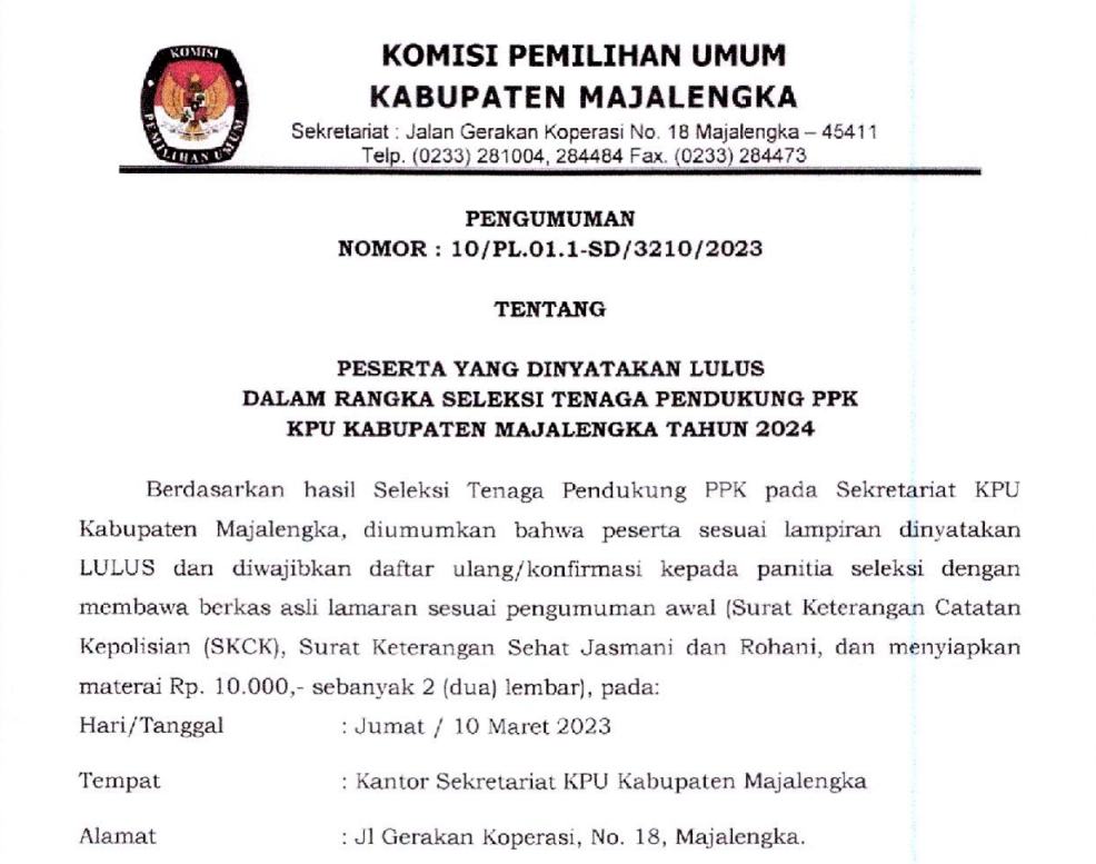 Berdasarkan hasil Seleksi Tenaga Pendukung PPK pada Sekretariat KPU Kabupaten Majalengka, diumumkan bahwa peserta sesuai lampiran dinyatakan LULUS dan diwajibkan daftar ulang/konfirmasi kepada panitia seleksi dengari membawa berkas asli lamaran sesuai pengumuman awal (Surat Keterangan Catatan Kepolisian (SKCK), Surat Keterangan Sehat Jasmani dan Rohani, dan menyiapkan materai Rp. 10.000,- sebanyak 2 (dua) lembar.