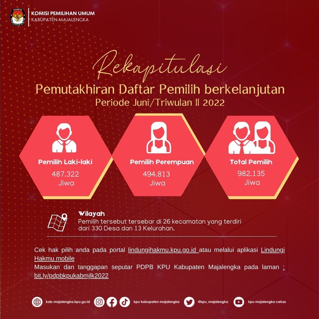 Rekapitulasi Daftar Pemilih Berkelanjutan dengan jumlah sebanyak 982.135 (Sembilan Ratus Delapan Puluh Dua Ribu Seratus Tiga Puluh Lima) dengan rincian pemilih laki-laki berjumlah 487.322 (Empat Ratus Delapan Puluh Tujuh Ribu Tiga Ratus Dua Puluh Dua) pemilih dan pemilih perempuan berjumlah 494.813 (Empat Ratus Sembilan Puluh Empat Ribu Delapan Ratus Tiga Belas) pemilih, tersebar di 26 (Dua Puluh Enam) Kecamatansesuai dengan rincian sebagaimana terlampir dalam Berita Acara.