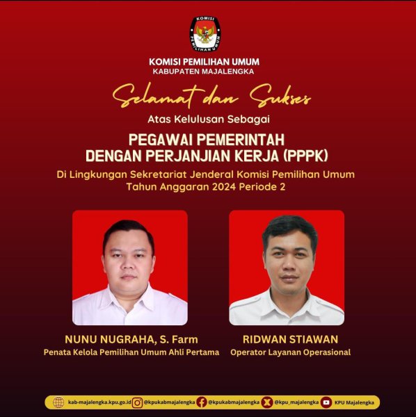 Komisi Pemilihan Umum Kabupaten Majalengka menyampaikan selamat dan sukses atas kelulusan sebagai Pegawai Pemerintah dengan Perjanjian Kerja (PPPK) di lingkungan Sekretariat Jenderal Komisi Pemilihan Umum Tahun Anggaran 2024 Periode 2 kepada: