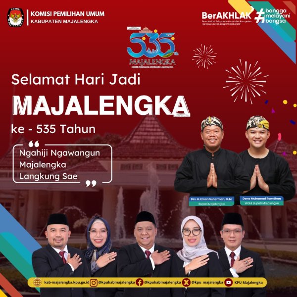 Dalam semangat persatuan dan kemajuan, Komisi Pemilihan Umum (KPU) Kabupaten Majalengka mengucapkan Selamat Hari Jadi ke-535 untuk Kabupaten Majalengka.