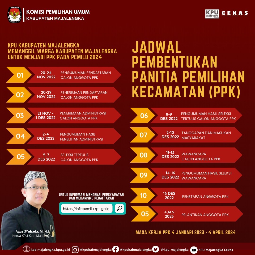 Berdasarkan surat Pengumuman Nomor : 1/PP.04.01.Pu/3210/4/2022 Tentang SELEKSI CALON ANGGOTA PANITIA PEMILIHAN KECAMATAN UNTUK PEMILIHAN UMUM TAHUN 2024, Komisi Pemilihan Umum Kabupaten Majalengka mengundang Warga Negara Indonesia yang memenuhi kualifikasi untuk mendaftarkan diri menjadi anggota Panitia Pemilihan Kecamatan, untuk Pemilihan Umum dengan ketentuan sebagai berikut: