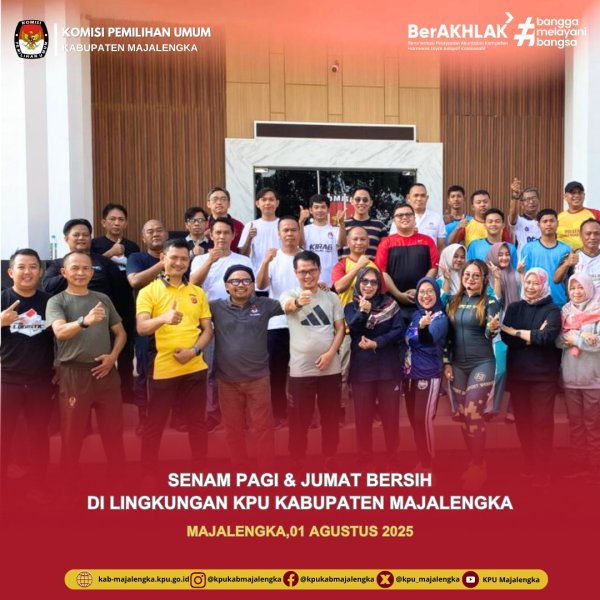 Majalengka, 1 Agustus 2025 — Komisi Pemilihan Umum (KPU) Kabupaten Majalengka melaksanakan kegiatan rutin Senam Pagi dan Jumat Bersih yang berlangsung di halaman kantor KPU. Kegiatan ini diikuti oleh seluruh jajaran sekretariat dan komisioner dengan penuh semangat dan antusiasme.