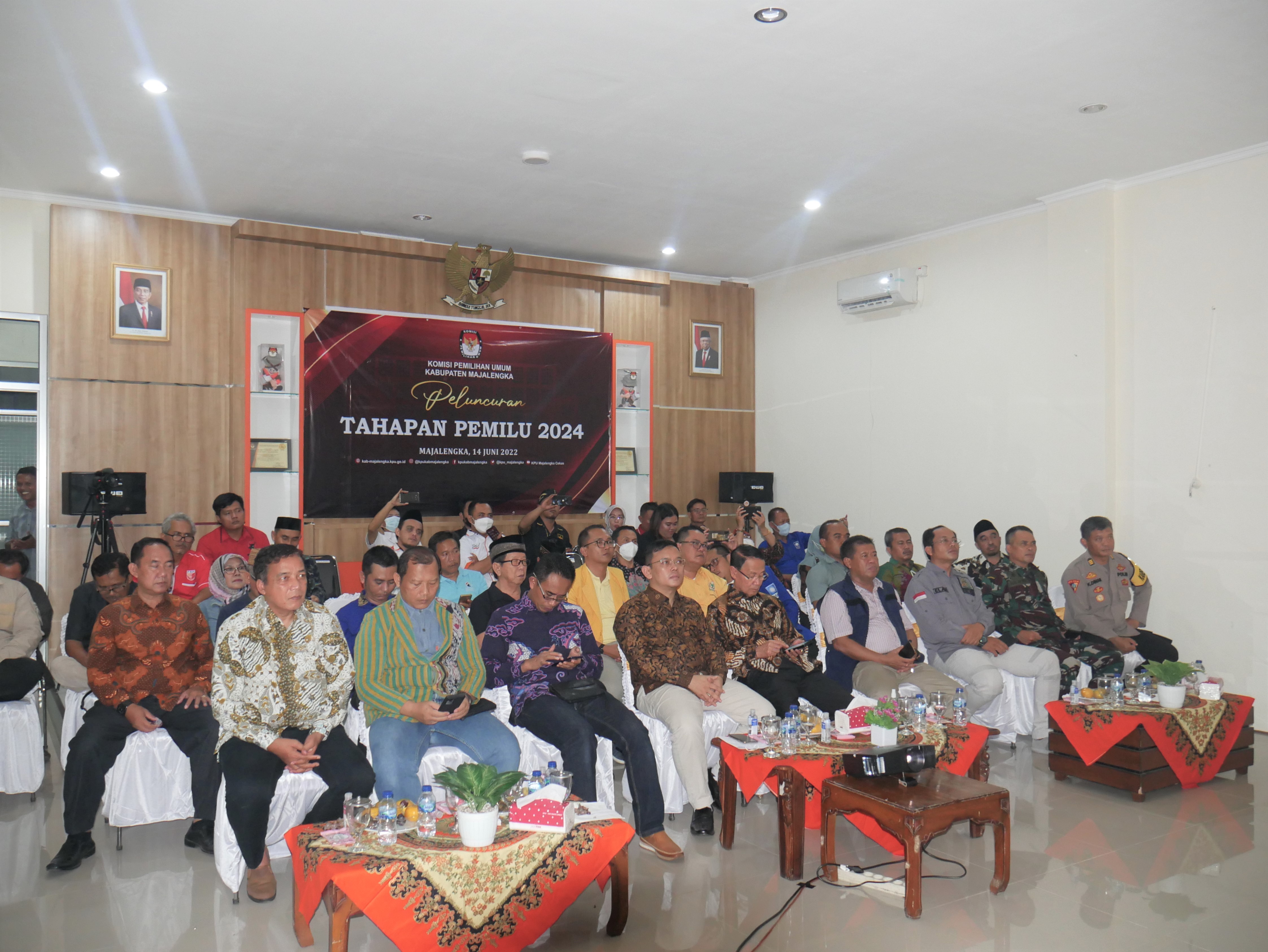 KPU Kabupaten Majalengka sendiri melaksanakan kegiatan “Nonton Bareng Peluncuran Tahapan Pemilu 2024” di Aula Syuhada KPU Kabupaten Majalengka. Kegiatan tersebut turut dihadiri oleh Bupati Majalengka, Sekretaris Daerah Majalengka, dan unsur Forkopimda lainnya. Dalam sambutannya, Ketua KPU Kabupaten Majalengka, Agus Syuhada menyampaikan, “KPU Kabupaten Majalengka telah siap untuk menyelenggarakan Pemilu Serentak 2024 di wilayah Kabupaten Majalengka”. Menyambung dengan yang disampaikan Ketua KPU Majalengka, Bupati Majalengka. Karna Sobahi dalam sambutannya menyampaikan, “Pemilu Serentak 2024 akan semakin kompleks, maka dari itu diharapkan KPU dapat bekerja dengan baik dan bekerja sama dengan seluruh stakeholderdan lapisan masyarakat”.